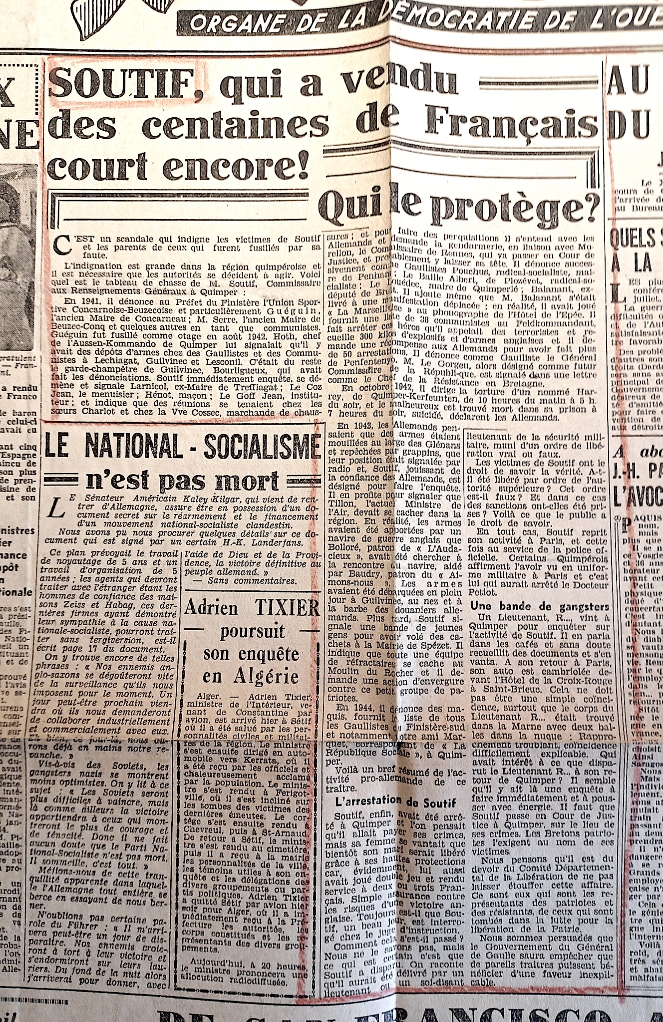 24 au 28 avril 1950 : défendu durant cinq audiences à la Cour de Justice de la Seine par l'avocat d'extrême droite TIXIER-VIGNANCOUR Jean-Louis, rivalisant d'ardeur pour discréditer les témoins à charge, victimes de SOUTIF, compagnons d'armes des fusillés et des exterminés.