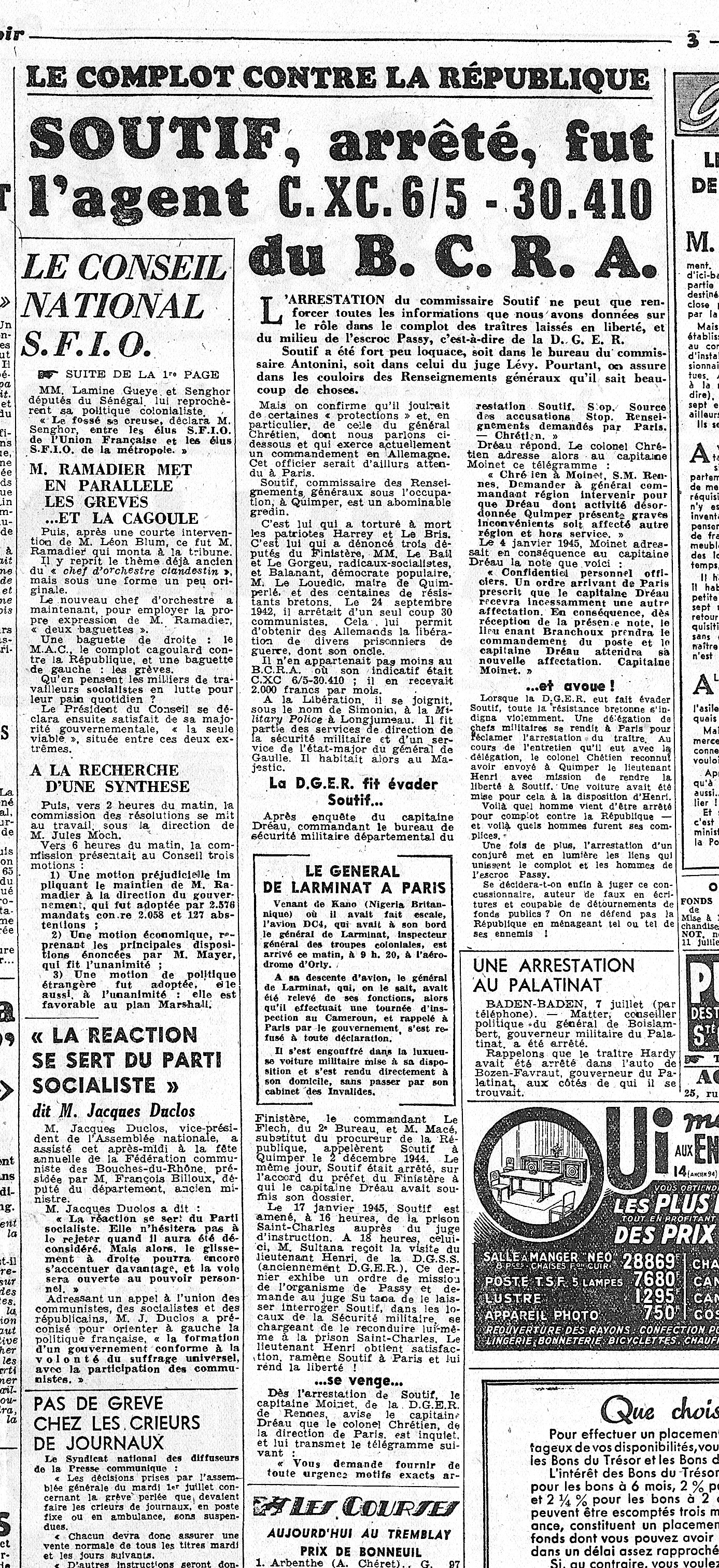 17 janvier 1945 : amené auprès du juge d'instruction. Un membre de la D.G.E.R. exhibe un ordre de mission de ramener SOUTIF à Paris dans une voiture militaire et lui rend la liberté.