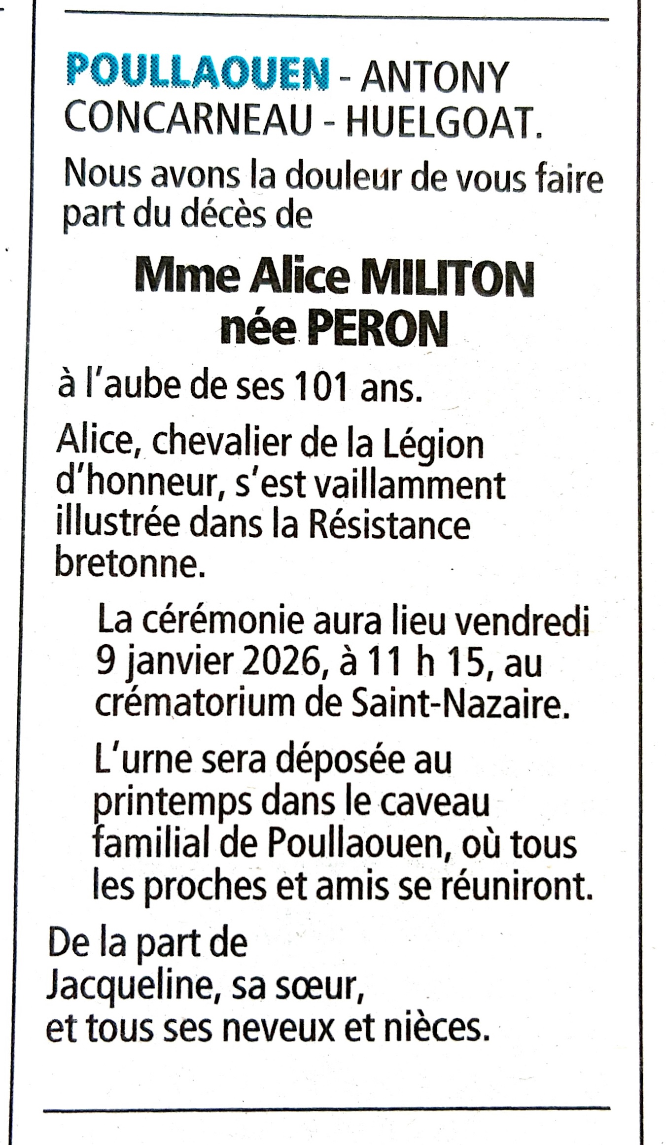 La correspondance complète avec « Alice Milliton née Péron » n’apparaît pas dans les documents historiques consultés : les archives consultées parlent surtout de Alice Péron et Marcelle Péron sans mention explicite de Milliton comme nom d’usage. Cela pourrait être un nom d’épouse ou un second nom familial (à vérifier).