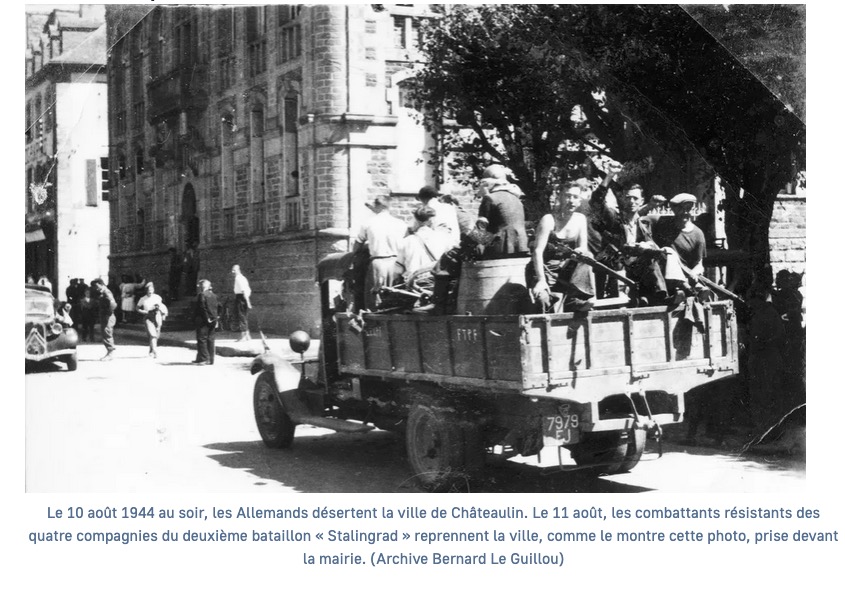 Date de la Commémoration : le 11 août 1944 le deuxième bataillon « Stalingrad », composé de 650 maquisards dispersés dans la région de Châteaulin, libérait la cité de l’Aulne après quatre années d’occupation allemande et avant l’arrivée des troupes américaines.