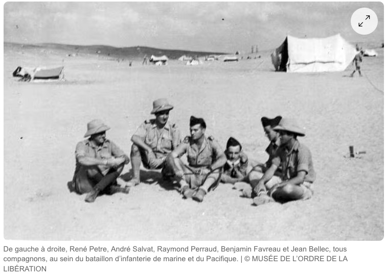 « Mon père, reprend-elle, est parti pour l’île de Sein dès le lendemain pour le rejoindre en Angleterre, alors qu’il ne le connaissait même pas de nom. Le voici débarquant à Plymouth avec les tout premiers volontaires français, puis rejoignant Londres, et en route pour l’Afrique avec ce premier corps expéditionnaire : le Sénégal, le Cameroun, la traversée du continent africain d’ouest en est jusqu’au Soudan pour rejoindre la vallée du Nil, la descente de celui-ci jusqu’en Égypte, puis la Syrie qu’ils atteignent fin 1941. »