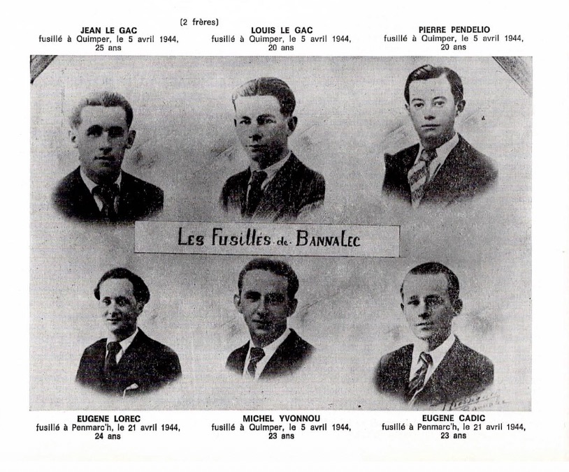 - 6 fusillés : Eugène LOREC (24 ans) ; deux frères LE GAC : Jean, 25 ans, et Louis, 20 ans; Eugène CADIC (23 ans); Pierre PENDELIO (20 ans); Michel YVONNOU (23 ans) ;