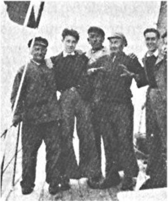 Le bateau ne porte aucune marque distinctive et pourrait être un de ceux lais- sés par les réfugiés Espagnols arrivés à Concarneau en 1936 l’un d’eux était amarré derrière la Ville-Close durant l’occupation. Tous les personnages sont en uniforme.